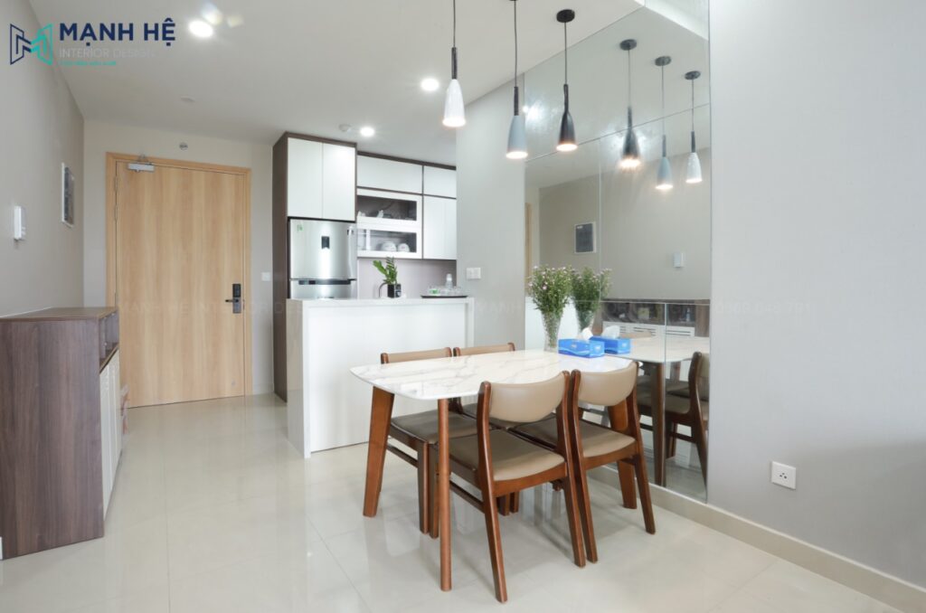 Bộ bàn ăn đặt sát tường, có vách ốp kính lớn để tạo chiều sâu không gian. Giúp không gian phòng bếp được nới rộng hơn
